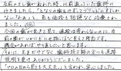ないなぁ」と、色も価格も相談なく治療され