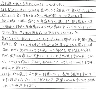 ものを噛んだ時に感じる圧迫感もなく、逆にまだ取り換えていない銀歯の部分の圧迫感ががより強く感じられるようになったので、そちらの方も早く取り換えたいと思うようになりました。