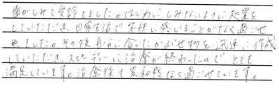 歯がしみて受診しました。始めにしみないように処置をしていただき、日常生活で不快に感じる事がなく過ごせました。その後自分に合ったかぶせものを迅速に作成していただきスピーディーに治療が終わったので、とても満足しています。