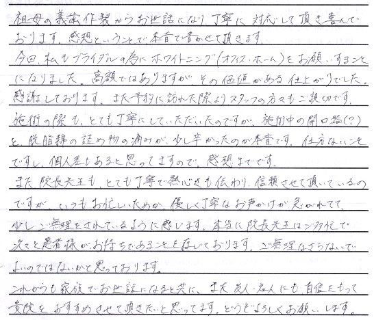 祖母の義歯作製からお世話になり丁寧に対応して頂き喜んでおります。感想ということで本音で書かせていただきます。
